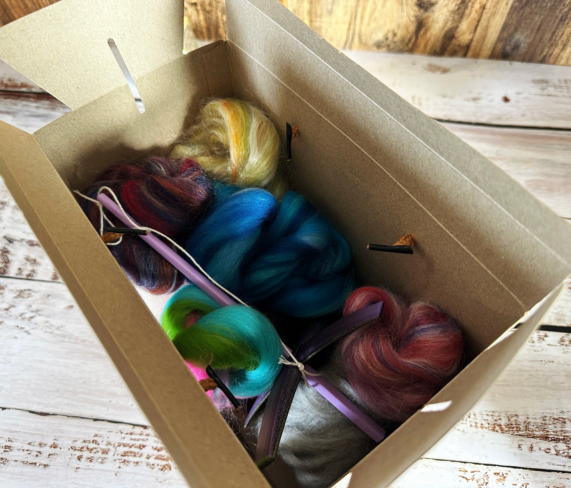 Inside your kit, you’ll find a generous assortment of fibers and fiber-blend roving balls. Every kit is unique, but can include a variety of fibers such as Shetland wool, alpaca or llama, merino, merino blends, and more. Sampling different fibers is one of the best ways to truly learn how to spin—and this kit lets you try them all.
