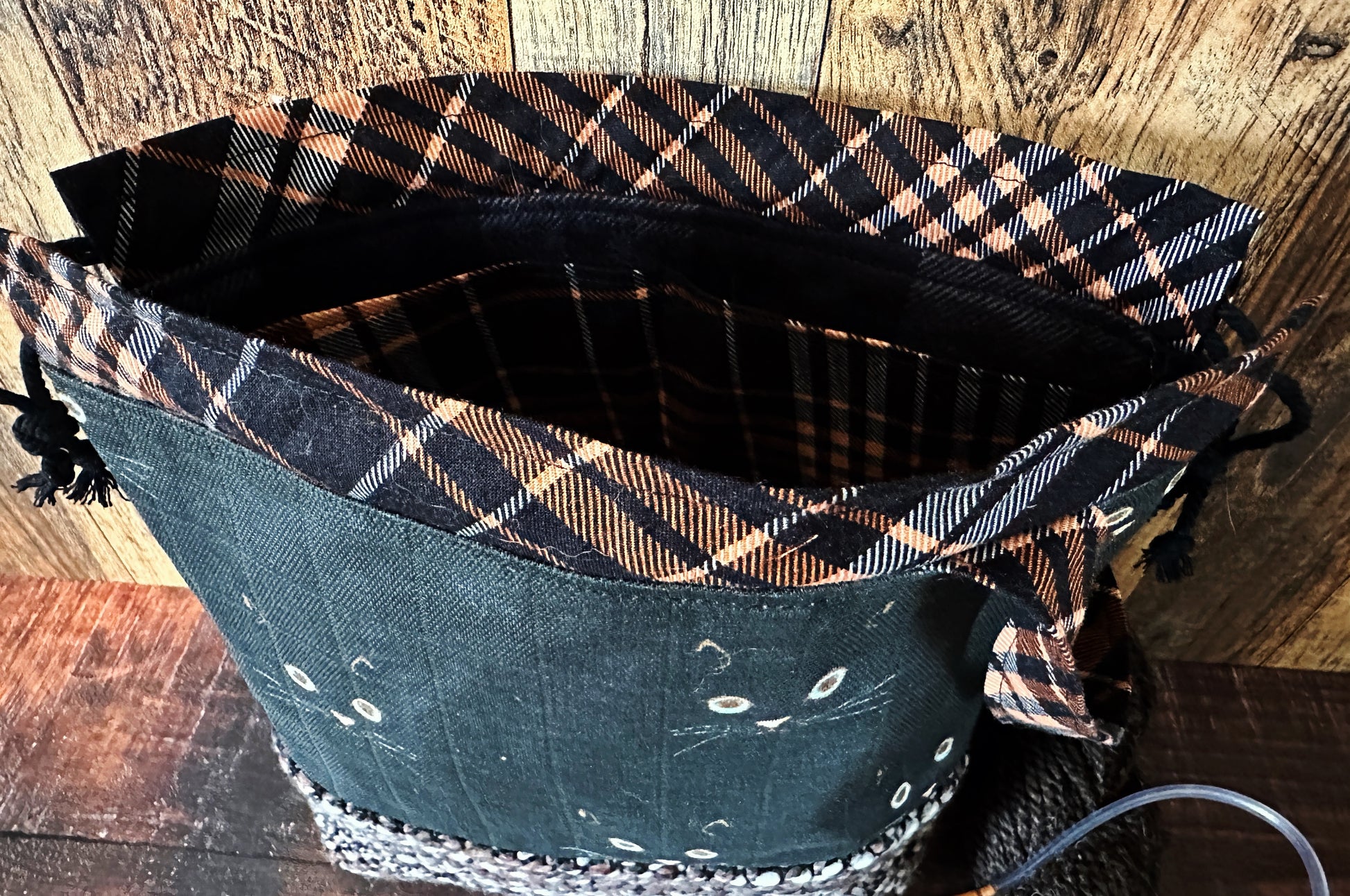 The ideal companion for your crafting endeavors on the move! These drawstring bags are meticulously crafted to cater to your knitting, crochet, sewing, or embroidery projects. Handmade with care, each bag is fully lined and boasts a stylish yet simple drawstring closure, enhanced with the convenience of a sturdy wrist strap.