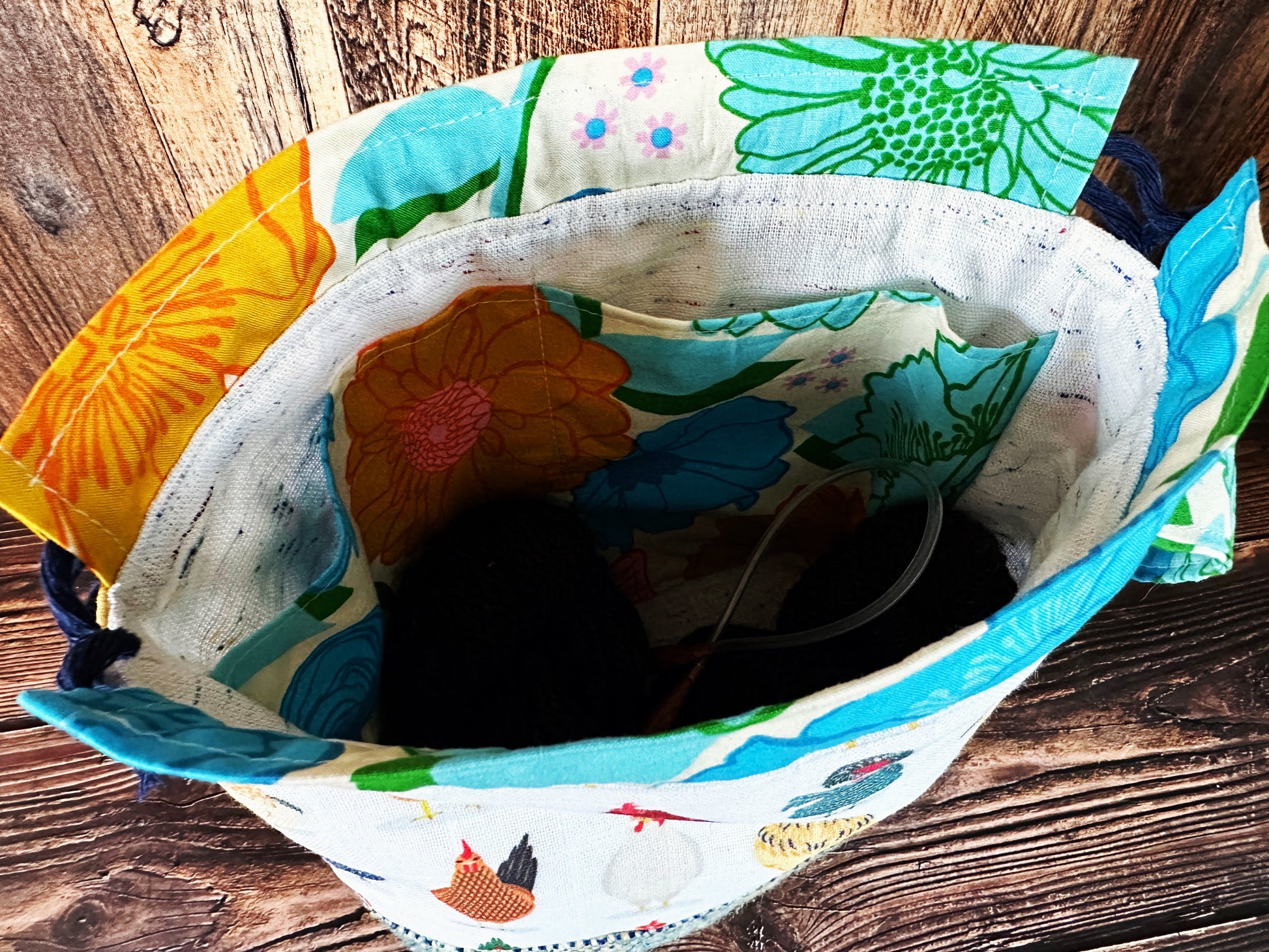 The ideal companion for your crafting endeavors on the move! These drawstring bags are meticulously crafted to cater to your knitting, crochet, sewing, or embroidery projects. Handmade with care, each bag is fully lined and boasts a stylish yet simple drawstring closure, enhanced with the convenience of a sturdy wrist strap.