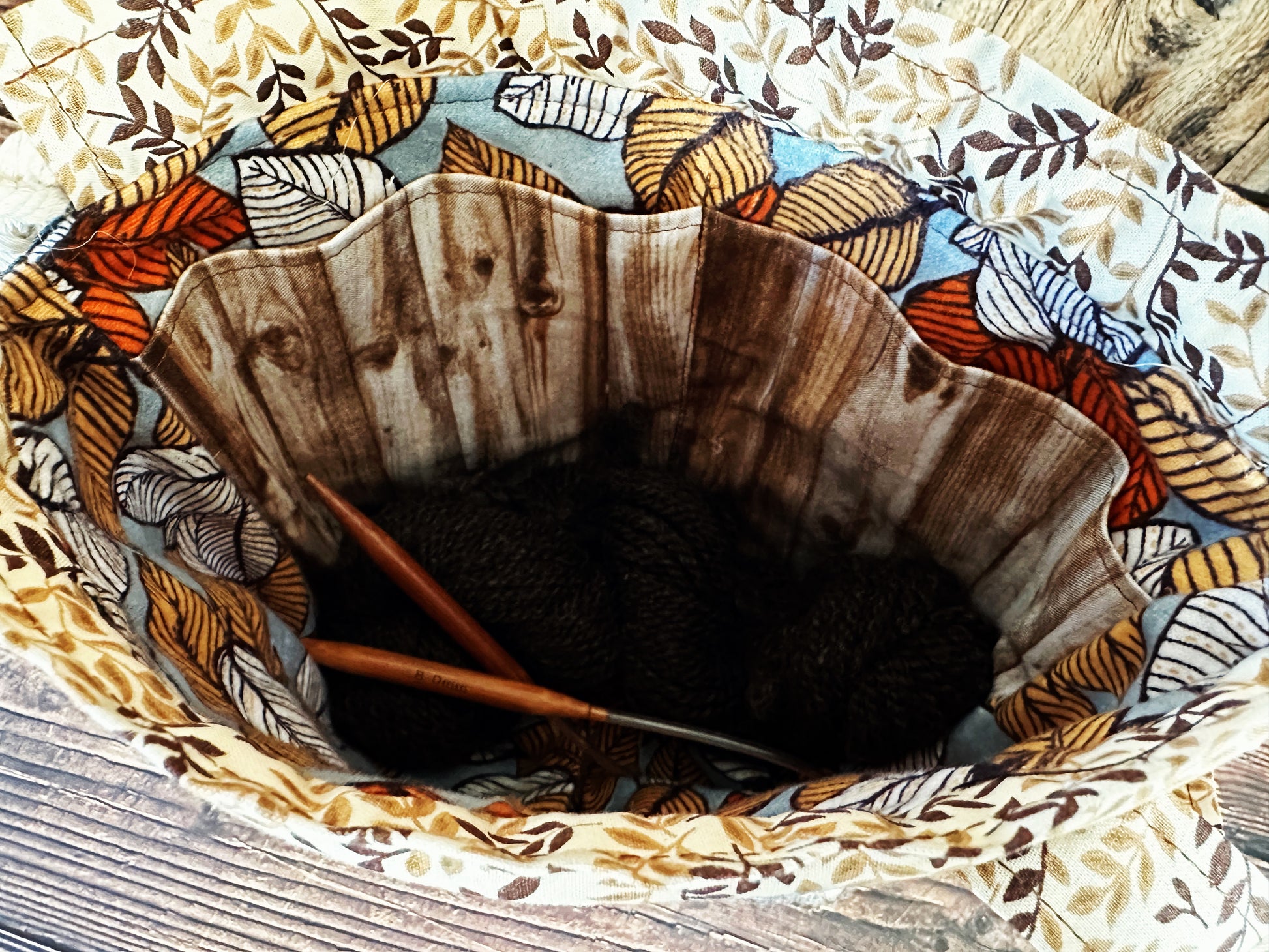 This bag is a size SMALL: 10 x 6½ x 3½ ~ Perfect for small projects, socks, hats and mittens. It easily fits two or three skeins of sock weight or one skein of worsted weight plus your project.