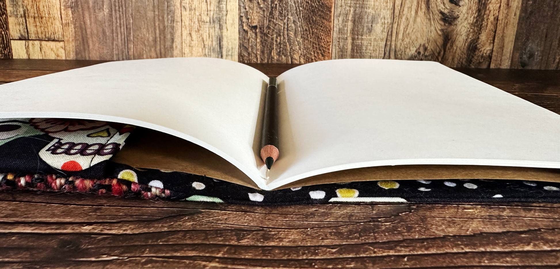 Designed to fit A5 journals, notebooks, and sketchpads, the cover features an adjustable construction that accommodates both slim notebooks and thick, well-loved volumes. Simply slide your book into the inner flaps and let the wool and coordinating cotton print wrap it in durable, handmade comfort.
