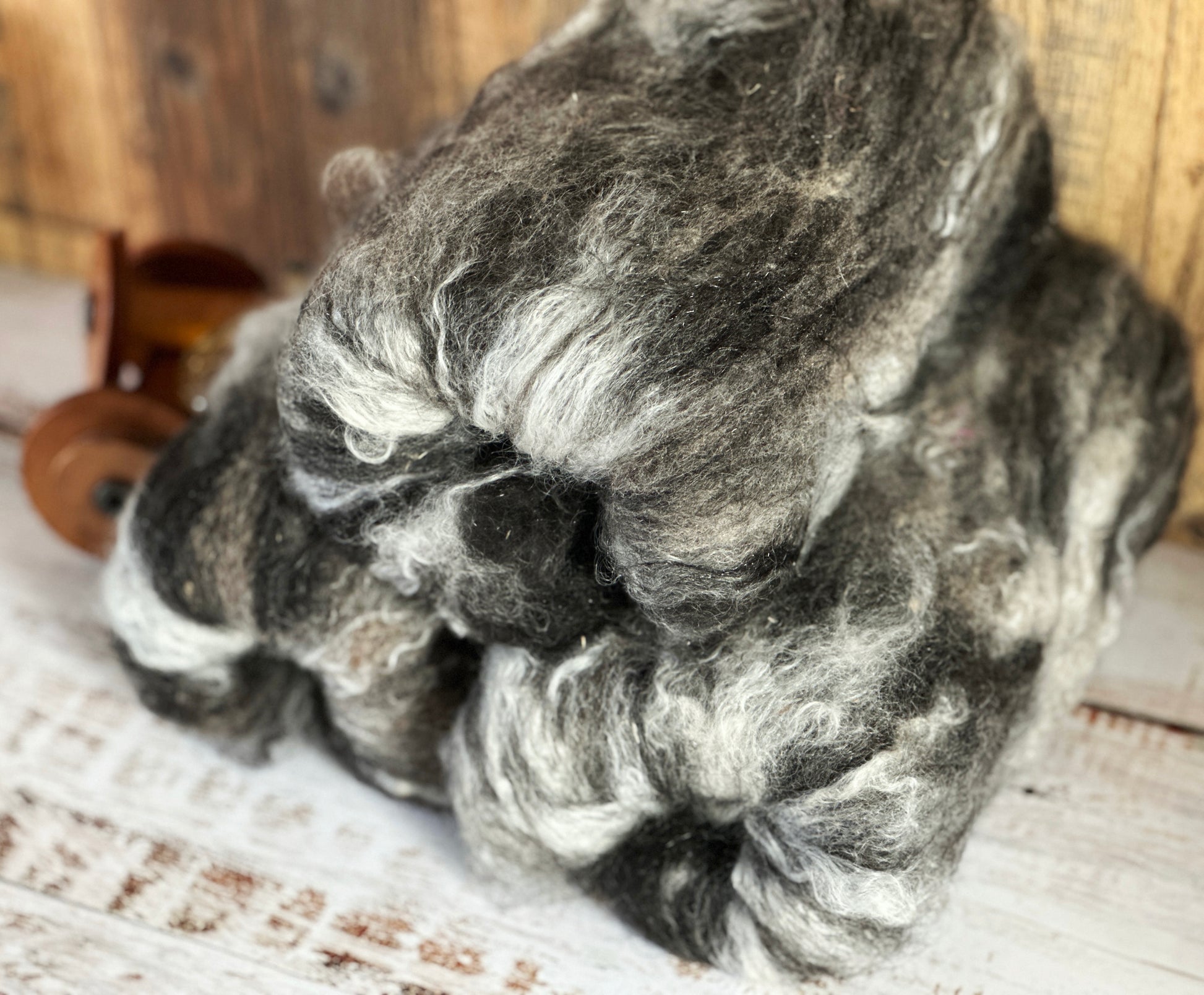 These batts are a blend of mohair and cashgora from my farm, a black alpaca from a friend's farm, and southdown wool from my sheep Betty. You get the softness and drape of mohair and alpaca with the spring and bounce of that super crimpy southdown.