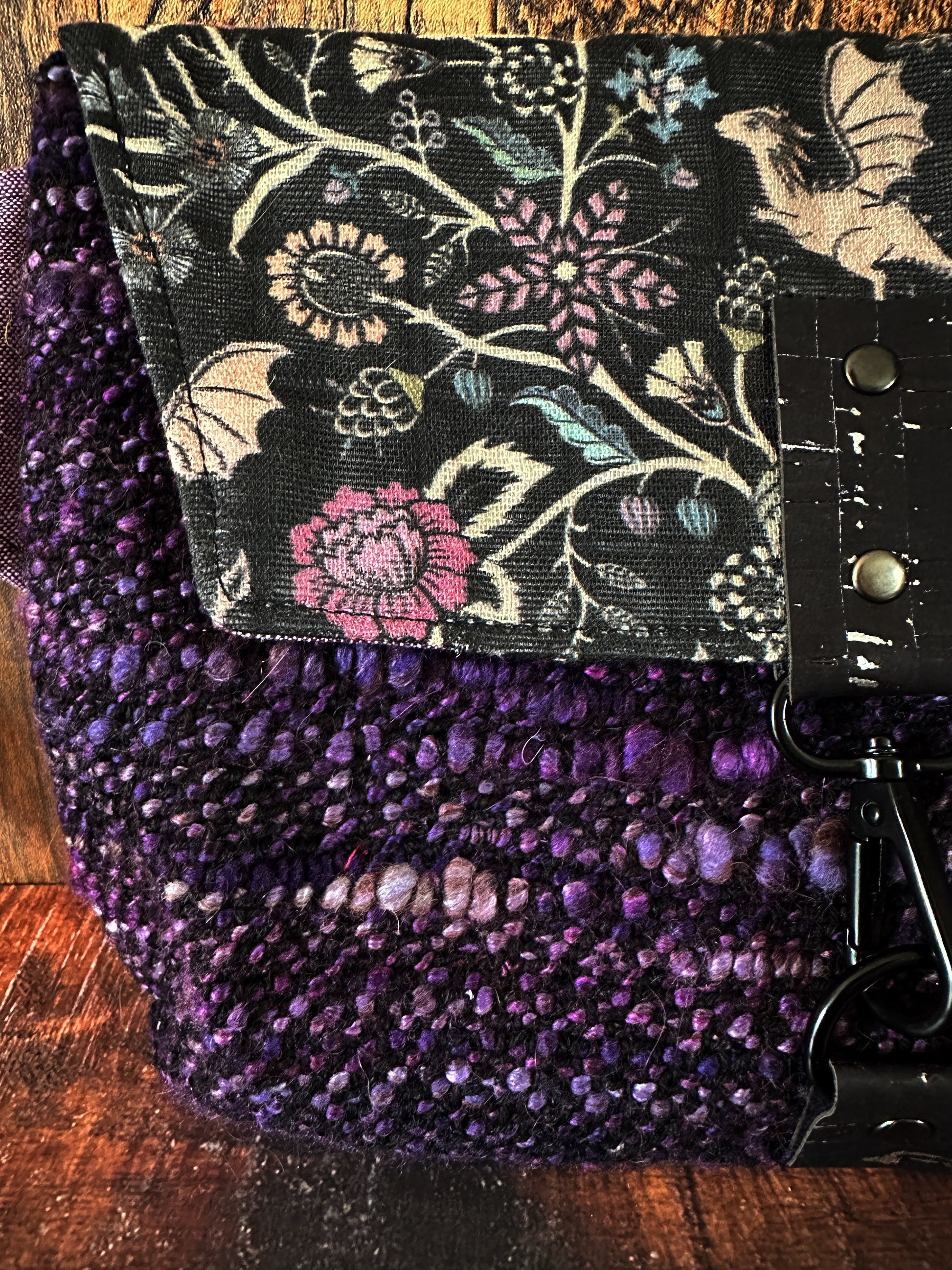 The exterior features a one-of-a-kind handwoven panel, crafted from handspun fiber sourced directly from my own flock of sheep and goats. Paired with a custom-printed cotton flap, cork detailing, and durable metal hardware, this bag blends natural texture with modern functionality.