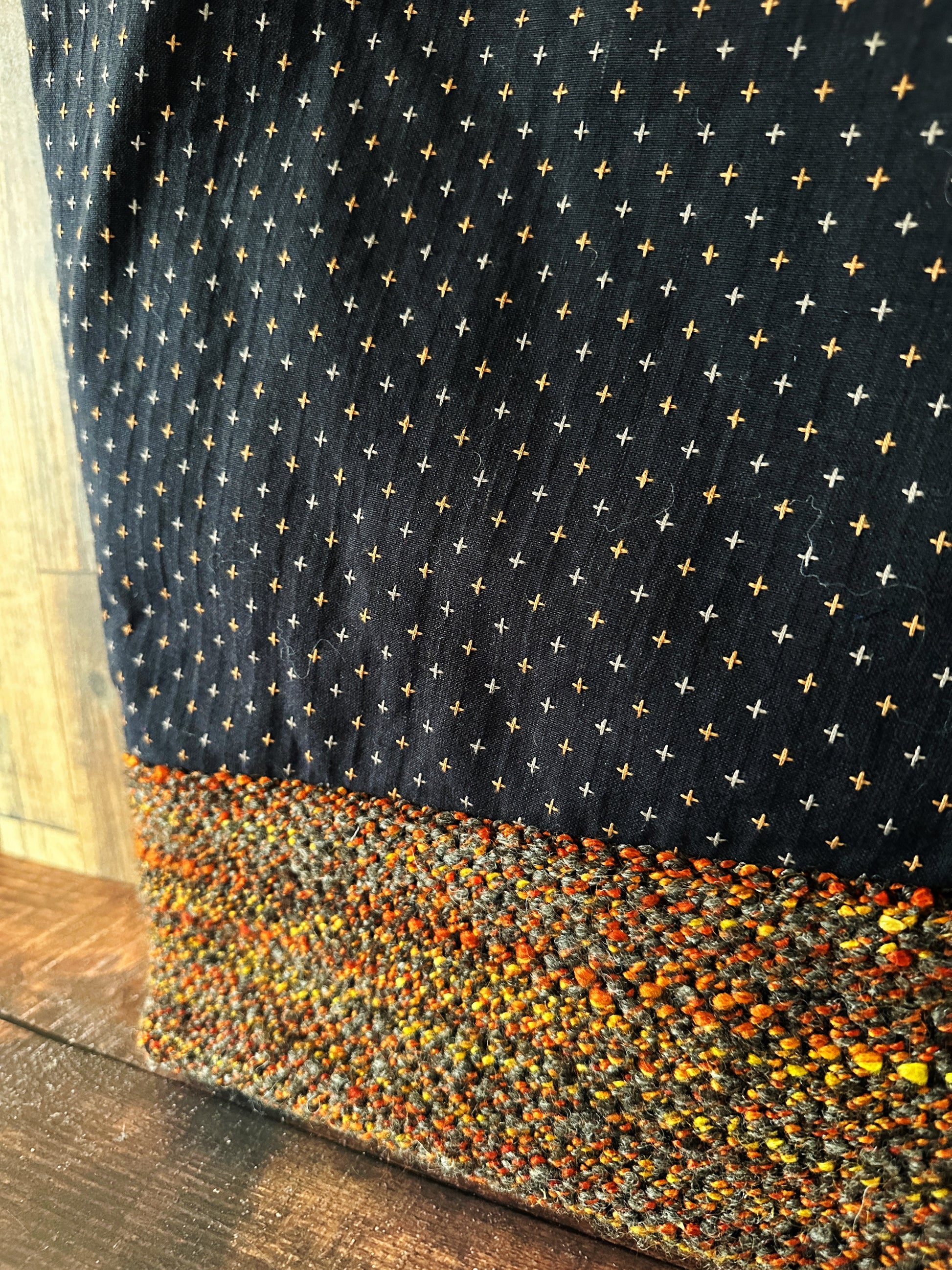 My exquisite extra-large tote, crafted for the adventurer in you! Made from custom printed cotton, cotton poplin, linen, and handspun and handwoven wool, it boasts both softness and structure, ensuring a perfect companion for any journey.